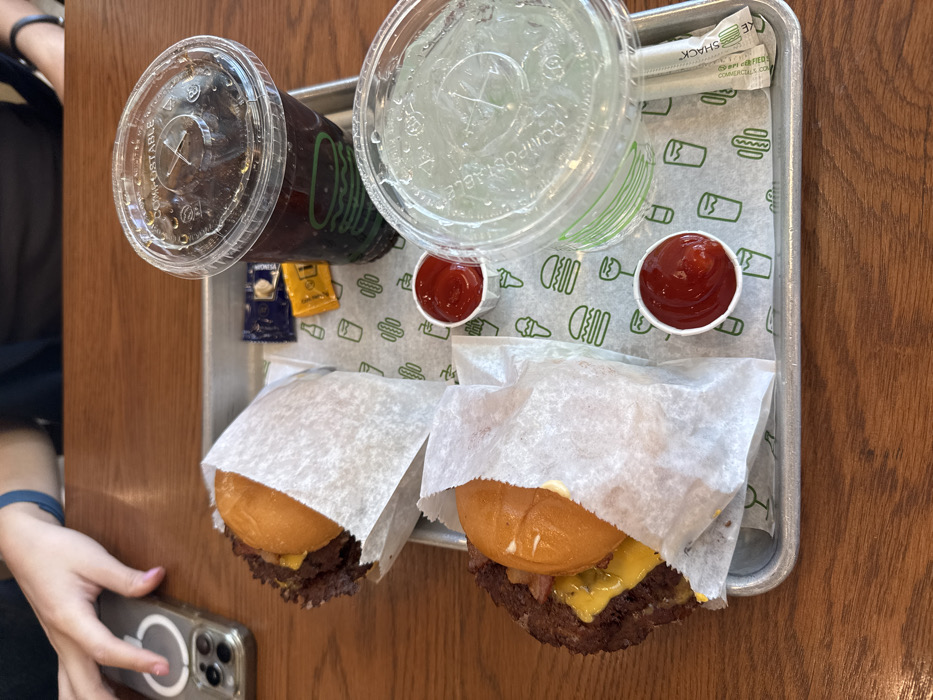 A metal tray holds a Shake Shack meal