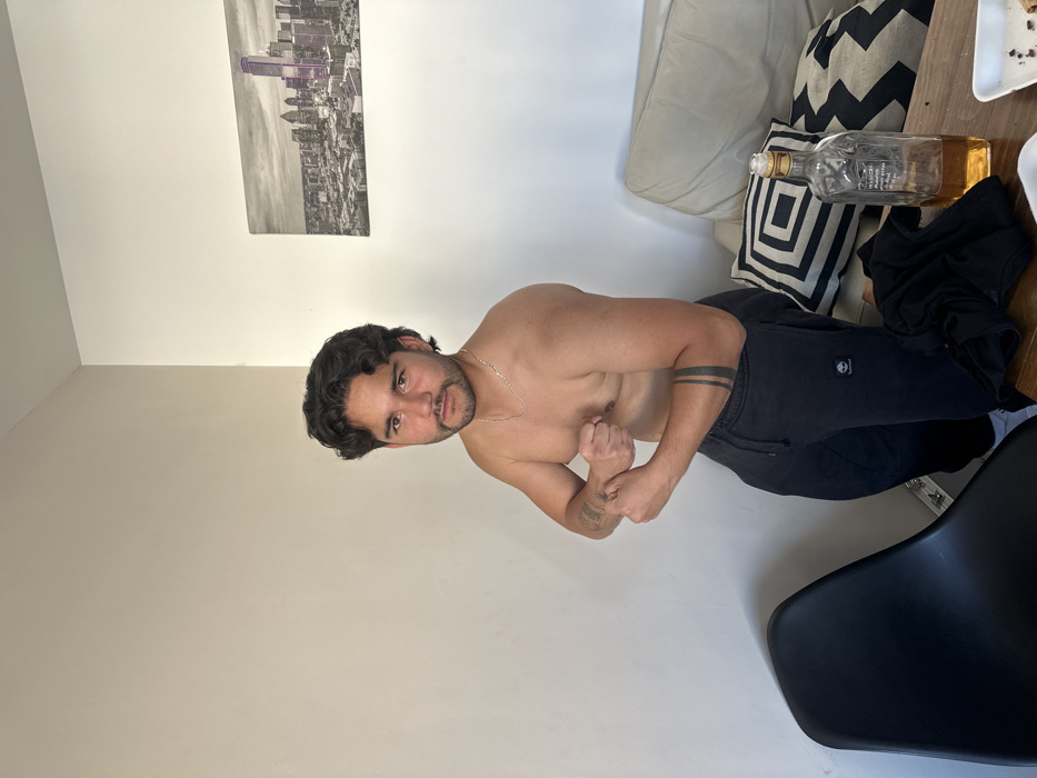 A shirtless man flexes his biceps, wearing black sweatpants and a silver chain. He is indoors with a white wall behind him. To his right, there's a couch with a geometric patterned pillow, a partially empty liquor bottle on a wooden table, and a black chair. A framed cityscape hangs on the wall behind the couch.
