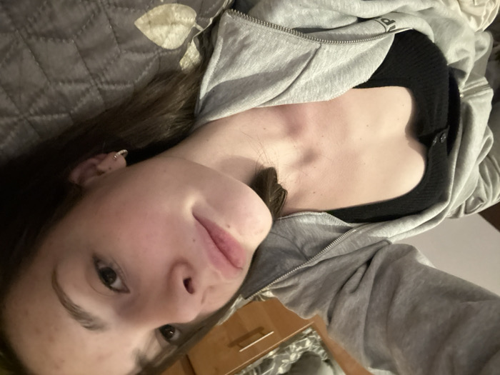 - "A young woman with fair skin and brown hair lies on a patterned gray surface, likely a bed or couch" by FM-5yziL2, licensed under CC BY 4.0