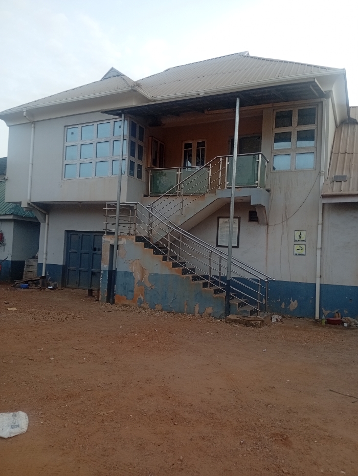 A two-story building with a staircase leading to the upper level is presented in the image. The structure features a mix of large, multi-pane windows and standard-sized windows. The exterior is painted in muted tones, with visible signs of wear and tear on the lower portion of the building. A metal railing runs along the staircase and balcony. The ground in front is dirt.