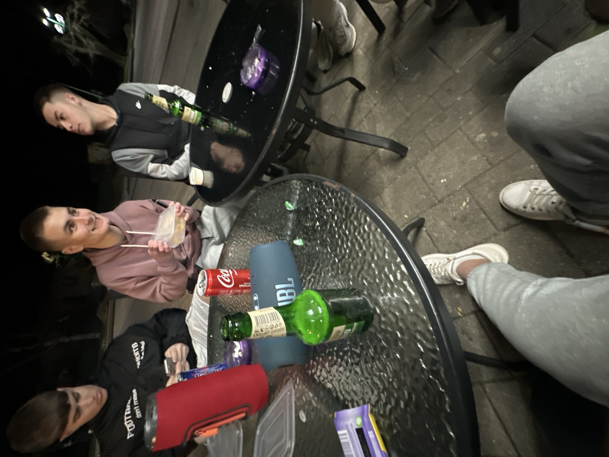 The image depicts an outdoor night scene in Pravets, Bulgaria, showcasing four young males seated at two adjacent round tables with black metal frames. The ground is paved with rectangular pavers. On the left, a male wearing a black hooded sweatshirt with white text is looking down at a smartphone in his hands. To his right, another male in a pink hooded sweatshirt is smiling, holding a clear plastic food container with yellow contents and a white spoon. At a separate black-surfaced table to the right, a third male in a grey and black Nike hooded sweatshirt is looking towards the other two. The perspective is from a fourth individual, whose legs in light grey sweatpants and white sneakers are visible in the foreground. The textured glass table on the left holds a red portable speaker, a red Coca-Cola can, a blue JBL portable speaker, an opened green glass bottle with a beige label, a clear plastic container lid, and a purple packet. The smooth black table on the right features another opened green glass bottle, a small white cup, a purple plastic ashtray containing cigarette butts and a lighter, and a white circular coaster. The setting suggests a casual social gathering.
