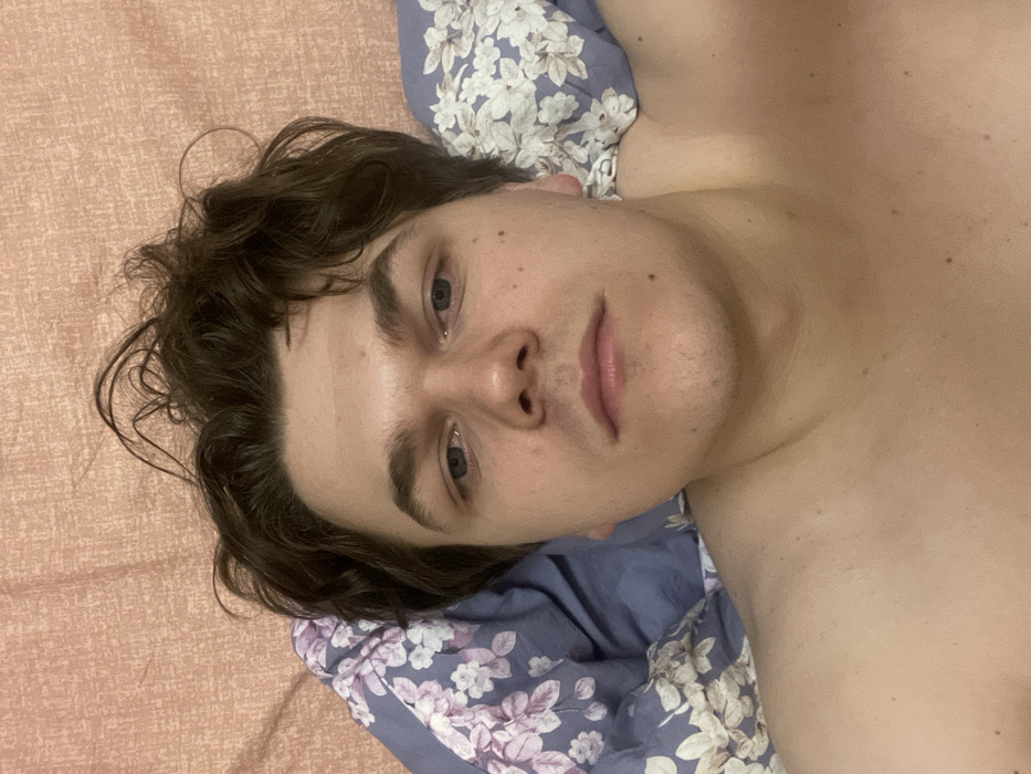 A young man lies on his back. He has dark, curly hair and light skin with a few visible moles. His eyes are a light color. He is resting on a pillow covered with a blue and white floral print. The bedding is a peach color. He is shirtless.