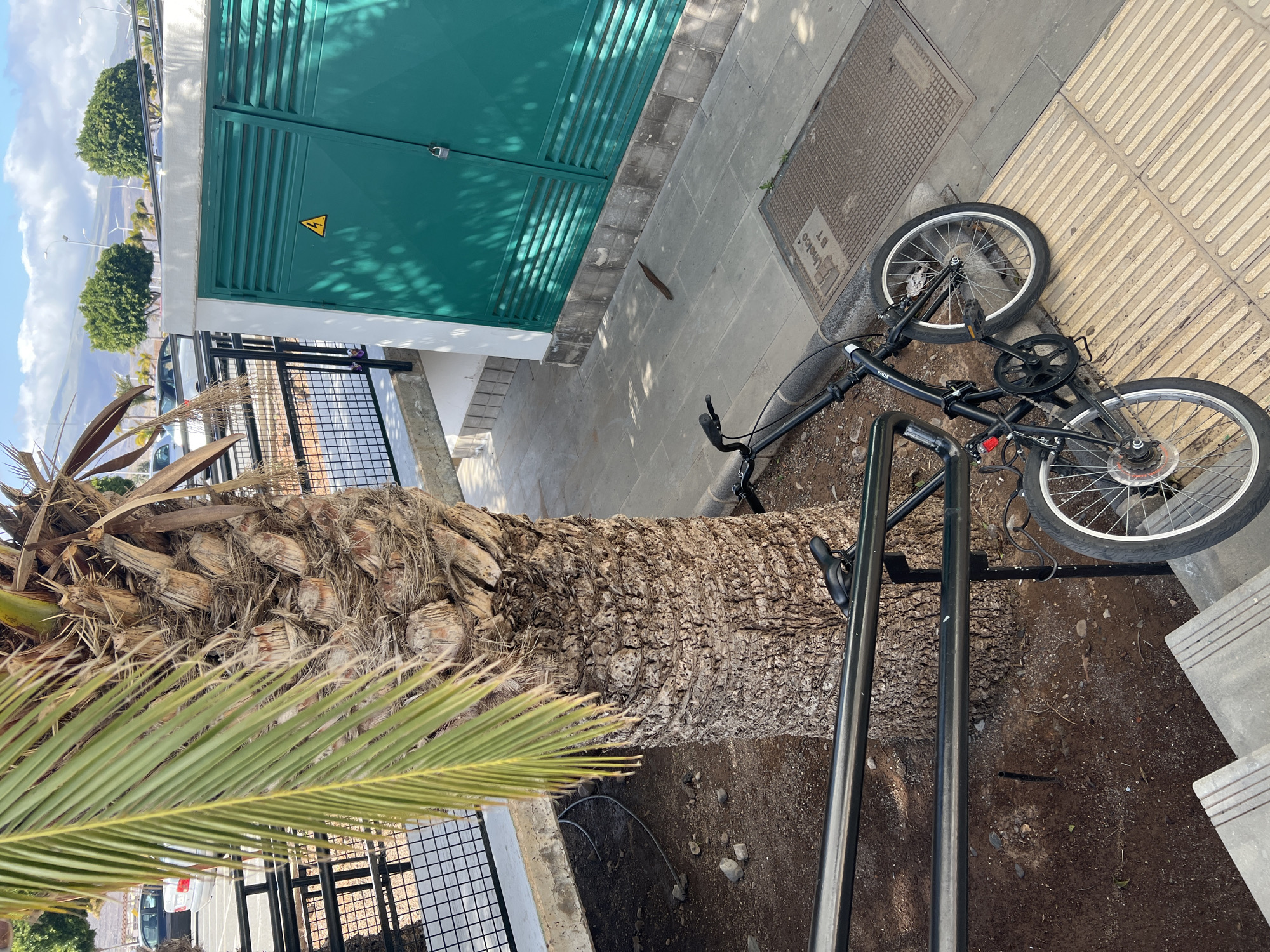 The scene depicts an outdoor urban environment in La Unión, Spain, under clear daylight with visible shadows. A large palm tree with a textured, fibrous trunk and green fronds occupies the left side of the frame. Leaning against a dark gray metal handrail, positioned between the palm tree and a concrete stairway, is a black folding bicycle. The bicycle features small wheels, a red taillight on the seat post, and a visible chain and crankset. To the right of the palm tree stands a small, white utility building with two closed dark green metal doors. The left door bears a yellow triangular hazard symbol with a black lightning bolt, indicating electrical danger. The right door is secured by a silver padlock. The ground directly in front of the utility building and extending to the bicycle is paved with light gray square concrete slabs. A dark, elongated object, possibly a piece of wood or metal, approximately 30-40 cm in length and tapered at one end, lies flat on these paving stones near the utility building. Two dark gray metal manhole covers are set into the pavement, one of which is embossed with "Unalco BT". Yellow tactile paving with parallel raised lines is present on the path. Around the base of the palm tree, the ground is a patch of dark brown dirt with scattered small rocks. Beyond a black metal mesh fence in the background, parked cars are visible. In the distant background, under a partly cloudy blue sky, lie several hills or mountains dotted with green trees and multiple white wind turbines, alongside streetlights. No individuals are present in the scene, and no active movement is observed.