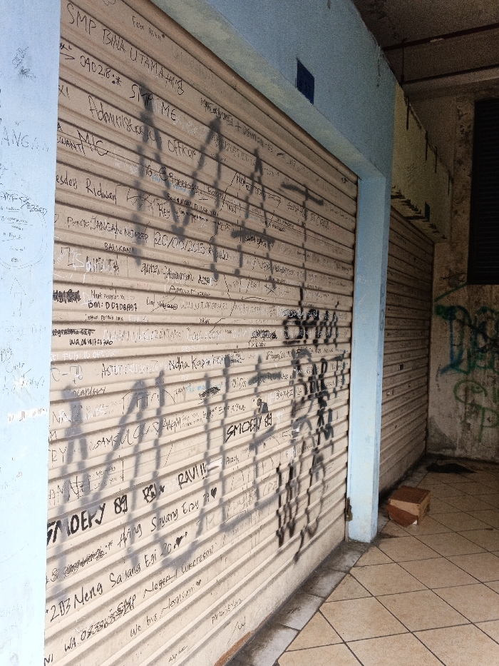 The image depicts a closed storefront in Kidapawan, Philippines, viewed from a low, angled perspective. The primary subject is a cream-colored, corrugated metal roll-down security shutter, extending from floor to ceiling and occupying the central and left portions of the frame. This shutter is extensively covered with numerous handwritten inscriptions in black marker, including names, dates (e.g., "09.02.18," "20/02/2015"), phone numbers/identifiers (e.g., "WA 08xxxxxxxxx," "BM: DD7D8A7"), and short phrases such as "SMP BINA UTAMA," "ADMINISTRATION OFFICER," "Presiden Ridwan," "JANGAN NGAPEZ," "BALIKAN!", "SMOEFY 89," "RAVIN," and "Neng Sayang Egi." A large, stylized black spray-painted tag with angular shapes is prominently overlaid on these inscriptions, casting a distinct shadow. To the left, a light blue painted concrete pillar or wall segment is visible, also bearing some faint graffiti. Above the shutter, a horizontal light blue painted beam or facade element features a small, dark blue rectangular inset. To the right, another light blue pillar marks a corner, leading into a recessed area. This area contains a second, closed roll-down shutter of similar design, and a concrete wall covered with green and black spray-painted graffiti. A dark rectangular opening, possibly a vent or window, is present in the upper right background, beneath what appears to be red ceiling conduit. The floor is covered with light brown square tiles, showing some dampness or reflections near the base of the main shutter. A small, partially collapsed cardboard box rests on the tiled floor in the lower right corner, against the base of the rightmost pillar. The scene is illuminated by an apparent interior or artificial light source, casting shadows diagonally across the main shutter from the upper left.