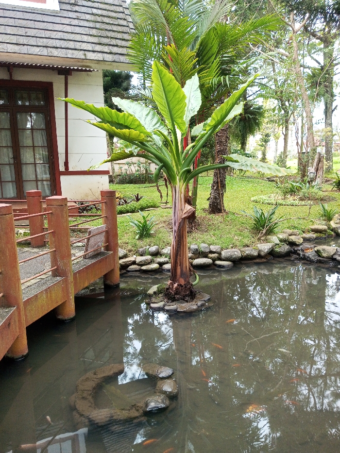 The scene depicts an outdoor garden area in the city of Orehat, India. The left side of a white building, featuring a dark shingled roof and brown trim, includes a multi-paned glass door or window. A murky pond occupies the foreground and mid-ground, containing numerous small, orange fish. A weathered, brown-colored bridge with posts and horizontal railings extends from the left, spanning a portion of the pond. A central broad-leafed plant with bright green foliage and a reddish-brown trunk stands on a small rock island within the pond. A semi-circular arrangement of submerged rocks is visible in the pond closer to the foreground. Surrounding vegetation includes multiple palm trees, various green shrubs, and a lawn of green grass. Taller trees with thin trunks are visible in the distant background. No individuals are present in the image.