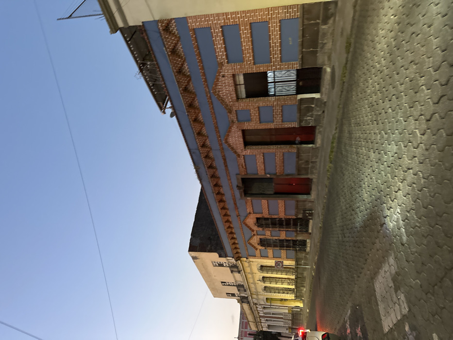 A sideways shot of a street shows buildings on the right with brick facades and blue panels. They have multiple entrances with dark, wooden doors. A cobblestone street with visible light reflections is on the right. A clear, blue sky fills the upper left, with a power line running across it. Other buildings are visible down the street. The image appears to be taken at twilight or early evening.