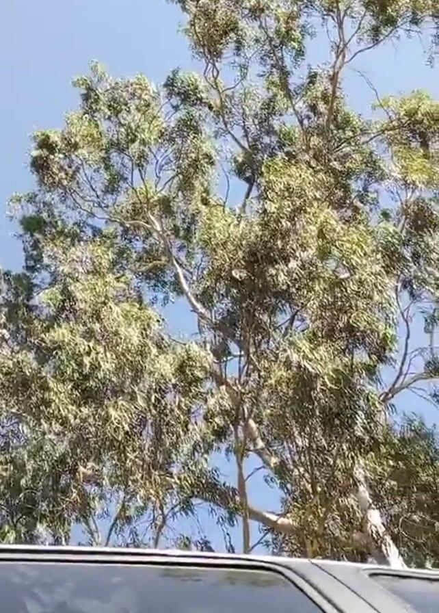 top of a gray car and a large, green tree against a clear blue sky. The camera angle looks upwards towards the sky, with the tree filling most of the frame. The leaves of the tree appear dense and are gently swaying in the wind. The sky is bright and cloudless. The car's roof is visible at the bottom of the frame, providing a sense of perspective.
