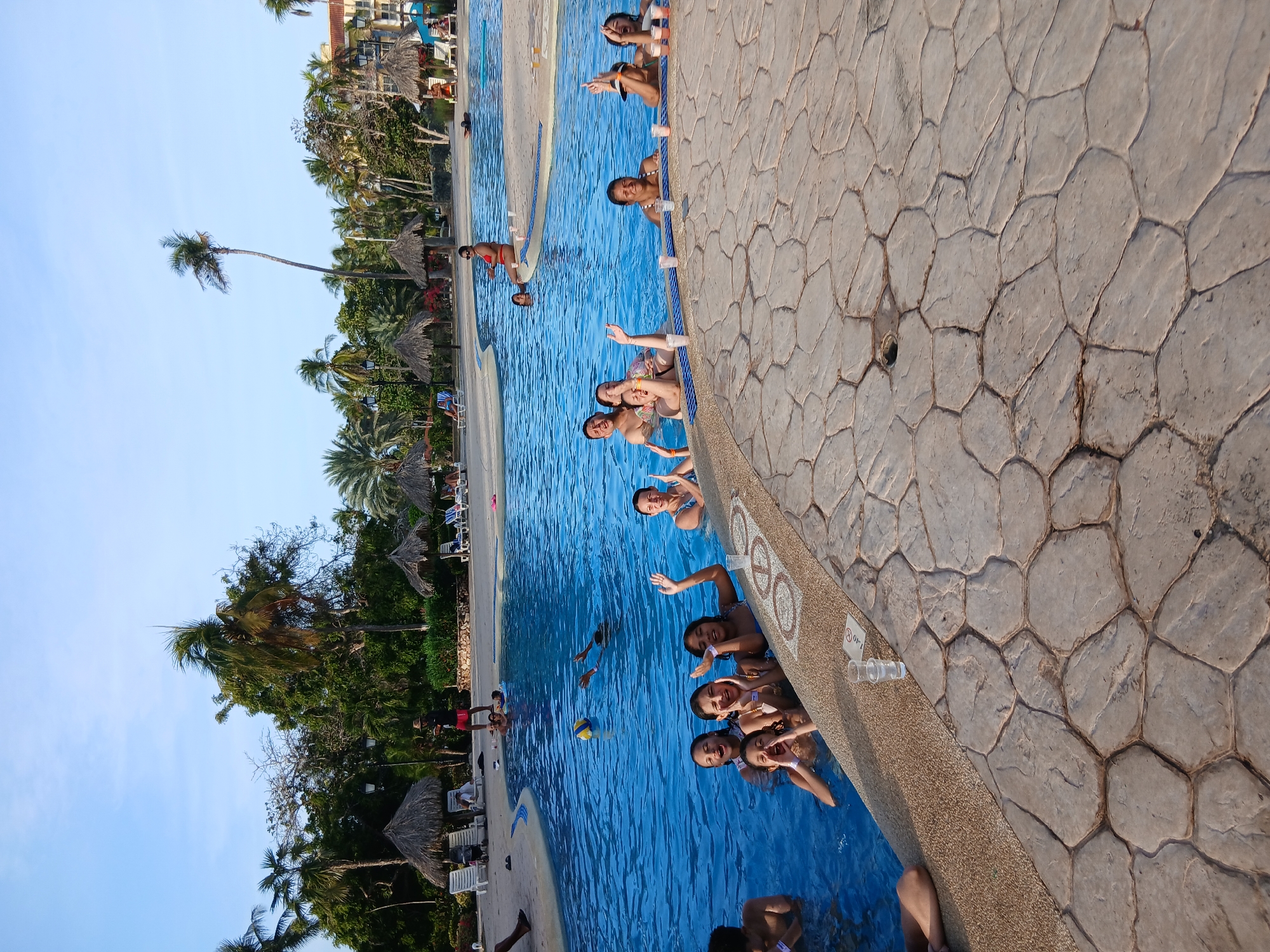The image captures a lively scene at a swimming pool in Playa El Agua, Venezuela