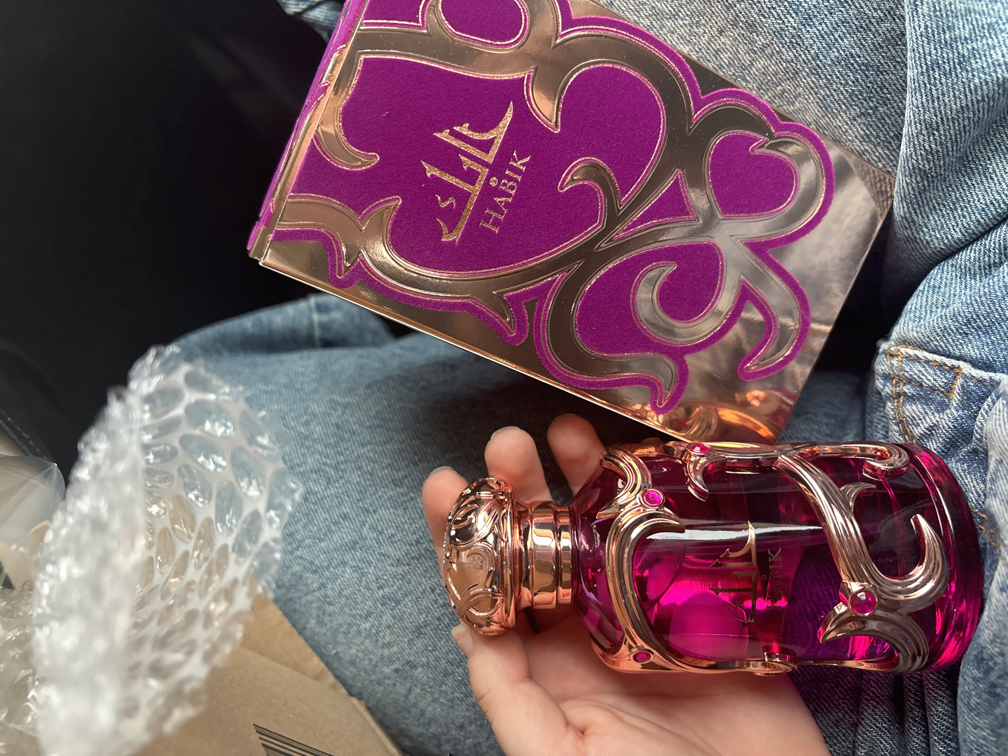 A close-up image depicts a person's light-skinned hand, with visible fingernails, holding an ornate perfume bottle. The bottle contains a translucent magenta liquid and is adorned with intricate rose gold-colored metallic filigree and small magenta circular embellishments. Partially visible on the bottle's side is text, including "HABIK" and accompanying Arabic script. Resting on blue denim fabric, likely clothing, is a rectangular perfume box. The box features a magenta-velvet-like surface with matching ornate rose gold metallic patterns, clearly displaying "HABIK" in rose gold Latin and Arabic scripts. Adjacent to the hand and bottle, in the lower left, is crumpled clear bubble wrap on top of a brown cardboard surface, indicative of packaging materials. The immediate background behind the box and person's arm consists of dark, out-of-focus areas. The scene is located in the city of Mizia, Bulgaria.