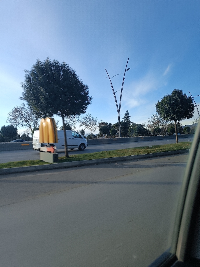 A white van travels along a road, passing a McDonald's sign obscured by a tree. A dark car is visible in the background. Modern streetlights rise against a blue sky dotted with clouds. Trees line the road, their branches mostly bare. The view is partially obscured by the interior of a vehicle from which the photo is taken. The road surface fills the foreground.