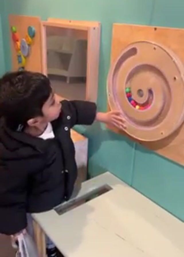 A young boy in a black puffer jacket is playing with a spiral marble run mounted on a wall. The run is made of wood and clear plastic, and it contains several colored marbles. The boy is using his hands to manipulate the run, causing the marbles to move. The room is decorated with light green walls and light-colored furniture. There are other interactive toys visible in the background, including a set of colorful gears and a mirror. The boy is wearing black-and-white sneakers and is holding a white towel in his hand.