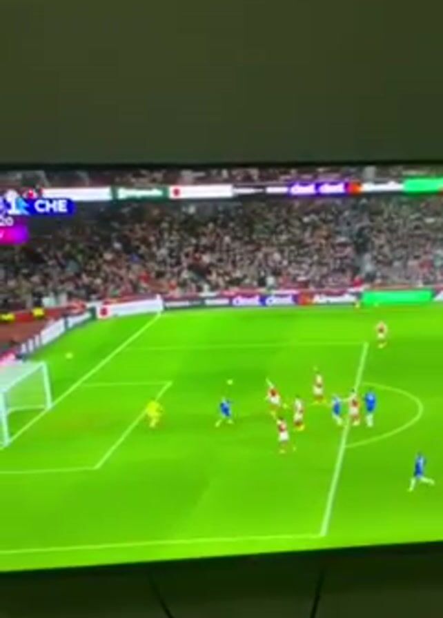 football game being played on a large television screen. The camera is held in a portrait orientation, capturing the screen from below. The game appears to be between Arsenal (in red and white) and Chelsea (in blue). The game is at the 95th minute, and the score is Arsenal 2 and Chelsea 1. A player wearing a blue uniform is lying in the goal. The area around the goal is packed with players from both teams. The stadium is filled with a large crowd of fans. The television screen has several advertisements along the bottom and sides. A black cable is seen dangling in front of the TV. The wall in the background is beige. The overall lighting suggests the room is dim.