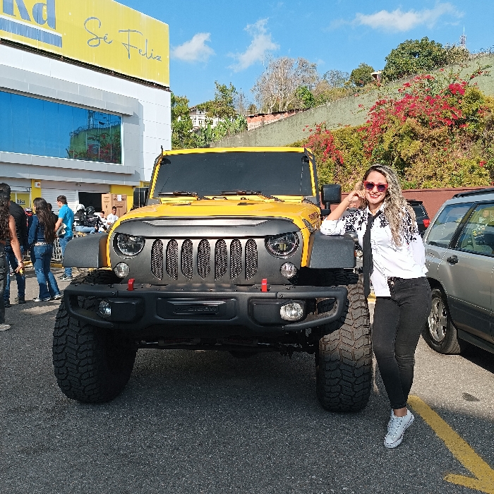 This image depicts an outdoor commercial scene, likely a parking lot, in Carrizal, Venezuela, under clear, sunny daylight. In the foreground and center, a bright yellow, heavily modified Jeep Wrangler is prominently displayed, facing the viewer. The vehicle features a custom black grille, a robust black aftermarket front bumper equipped with two visible red recovery shackles, and large, aggressive off-road tires. To the right of the Jeep, a female individual stands posing. She has light-colored, wavy hair and is wearing red-framed sunglasses. Her attire consists of a white long-sleeved shirt with a black abstract pattern, a black necktie, dark pants, and white sneakers. She is smiling, with her right elbow resting on the front-right fender of the Jeep. In the midground, behind the Jeep and to the left, is a multi-story building with a white facade and prominent blue-tinted reflective windows. A large yellow sign on the upper portion of the building displays the text "Sé Feliz," with another partial sign visible below it starting with "Kd." Several other individuals are visible near the building's entrance, engaged in casual movement or standing. To the right of the Jeep, a silver or light grey SUV is partially visible, parked adjacent to the primary vehicle. The background features a verdant hillside, densely covered with green trees and bushes, including a section with vibrant red flowering plants. The sky above is clear blue with scattered white cumulus clouds. The ground is paved with dark asphalt, and a yellow line marking is discernible on the pavement near the feet of the posing woman.
