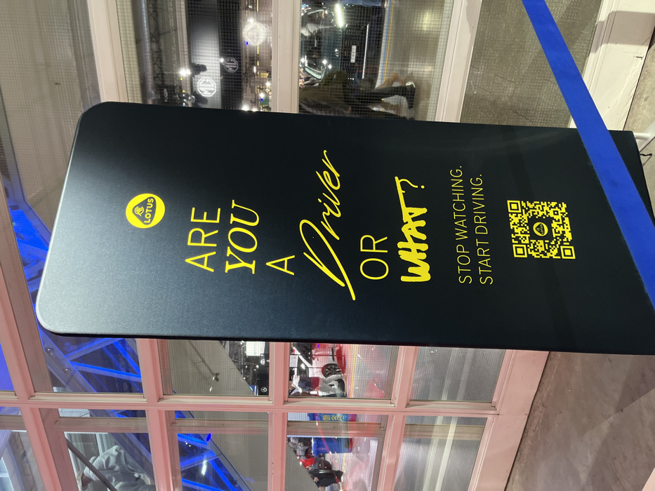The image displays an indoor scene within a large exhibition hall, identified as Messe Zürich in Zurich, Switzerland, consistent with a car show or multi-brand dealership environment. The primary subject is a tall, dark-colored, rectangular display stand with rounded corners positioned centrally in the foreground. At its top, the stand features a circular yellow Lotus logo. Below the logo, yellow text in two distinct fonts reads, "ARE YOU A Driver OR WHAT?". Further down, additional yellow text states, "STOP WATCHING. START DRIVING." A yellow QR code, with an embedded Lotus logo, is present at the bottom of the stand. A blue rope barrier extends horizontally across the lower foreground, partially obscuring the base of the stand. To the left of the stand, a light-framed, multi-paneled glass partition provides a view into an adjacent area. Through this partition, an escalator or staircase with blue accent lighting is visible, with several individuals ascending it, including one wearing a light grey hooded sweatshirt. Beyond this, parts of a large, open exhibition space are seen, featuring a reddish-hued floor, several parked vehicles, and blurred figures of people. To the right of the stand, a large glass window or wall reveals more of the exhibition space. Through this glass, a dark-colored vehicle, possibly an SUV, with illuminated headlights and a visible Swiss (CH) license plate, is parked. In the background, reflections of ceiling structures are visible, along with a prominent "MG" logo and possibly "Auto" signage on a distant wall or banner. Several individuals are seen walking in the mid-ground, with one person in dark attire partially visible walking past the dark vehicle. The floor in the immediate foreground consists of a light grey concrete or similar surface. The overall lighting appears to be a mix of ambient artificial light and brighter blue accents in the background.