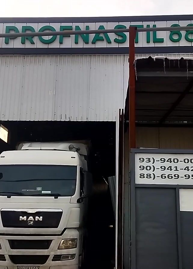 The camera is looking up at a white MAN truck parked inside a building. A sign for "PROFNASTIL 888" is visible at the bottom of the frame. To the left is a tan brick wall and a gray sign with phone numbers. The camera is tilted.