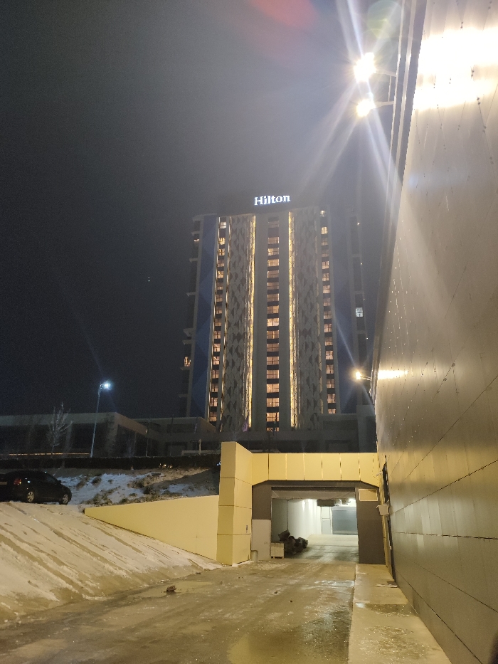 A Hilton hotel towers in the night sky, illuminated with light emanating from its many windows. Below, a tunnel-like structure extends into the building. The ground is covered in a slushy mix of water and snow. To the left, a dark car sits parked atop a snow-covered berm. Street lights cast a glow across the scene, adding to the overall ambiance of a cold, winter night.