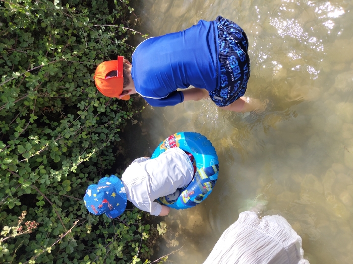 An outdoor scene depicts three individuals in shallow, clear, light-brown tinted water, positioned against a dense backdrop of green leafy foliage, located within the Maale Yosef Regional Council, Israel. To the immediate left, the lower portion of an individual, clad in a light-colored, pleated garment, is visible, standing in the water. In the center-left, a young child, viewed from the rear, wears a white long-sleeved shirt and a blue bucket hat patterned with white stars and red elements. This child is seated within a blue inflatable swim ring featuring a checkered pattern and various graphics, facing towards the foliage. To the right, a second child, also viewed from the rear, wears a blue long-sleeved swim shirt, dark blue swim shorts with white text graphics, and an orange baseball cap. This child is standing in the water, leaning forward slightly. The water's surface exhibits numerous sun reflections, and the bed beneath is stony. The background consists of a dense growth of green leaves and branches, extending from the water's edge upwards.