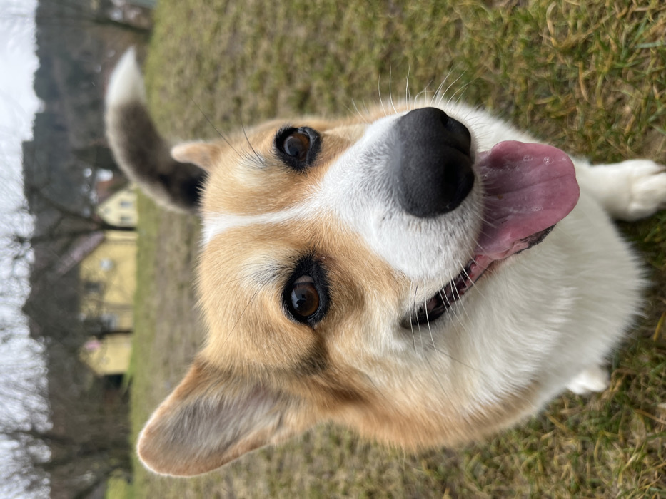 - "A low-angle, close-up photograph captures a tricolor Corgi dog in a crouched position on a grassy outdoor surface in Gangloff, Germany" by FM-4GKkh1, licensed under CC BY 4.0