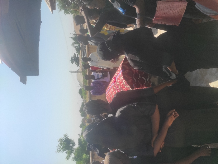The image depicts an outdoor gathering in Langtang, Nigeria, centered around a coffin