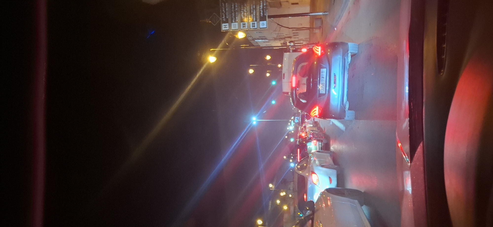 The image depicts a nighttime street scene in the city of Rabat, Morocco, characterized by dense vehicular traffic. The perspective is from inside a vehicle, looking forward through the windshield. In the foreground, the lower portion of a vehicle's dashboard and windshield are visible. The windshield reflects ambient light, creating red and blue streaks. The midground features multiple cars queued in at least two lanes of traffic, appearing stationary or moving slowly. The vehicle directly ahead is a dark-colored hatchback, possibly a Peugeot, with its red brake lights illuminated and a legible Moroccan license plate "7258 J 1". To its left, a light-colored sedan, possibly a Hyundai, is also visible with illuminated red brake lights. Further down the road, a continuous line of red brake lights indicates additional vehicles. The background reveals a dark night sky with various light sources. Numerous streetlights emit yellow-orange and blue-white light, causing prominent lens flares across the image. On the right side, a multi-tiered street sign post is prominent. The signs, written in Arabic and French, direct traffic to several locations: * The top sign, marked with an "H", refers to "Hôpital Militaire Mohammed V" (Mohammed V Military Hospital). * Subsequent signs mention "Base Aérienne Salé" (Salé Air Base), "Féria du Moudjhad" (Moudjhad Fair), and "Aéroport International Rabat-Salé" (Rabat-Salé International Airport). Adjacent to the street sign on the right, a light-colored building with multiple windows is visible. No individuals are clearly discernible in the scene. The road surface appears dark and reflective, suggesting it might be wet or reflecting the intense city lights. The location is definitively identified as Rabat, Morocco, on a major thoroughfare, likely within the Agdal district or an adjoining area, given the proximity and signage for the Mohammed V Military Hospital, which is located in Rabat, and directions to Salé-related destinations.