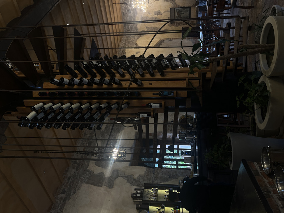 The image captures the dimly lit interior of an establishment in Domingo Arenas, Mexico, presenting a rustic-industrial aesthetic. A prominent, multi-level spiral staircase constructed of dark metal and wood occupies the central space, its central column integrated as a wine rack displaying numerous bottles of red wine horizontally. A few bottles are also placed on the staircase steps. To the left, a bar area features a dark counter. Behind it, shelves are stocked with various liquor bottles and glassware. A male individual, dressed in a dark shirt, stands behind the bar, oriented away from the camera. Coffee preparation equipment is visible on the bar counter. A dark, caged chandelier hangs above this area. The walls throughout the space are composed of exposed, rough-hewn stone, suggesting an aged structure. The ceiling is characterized by visible wooden beams. In the background to the right, a dining area contains multiple wooden tables and chairs, along with booth seating upholstered in blue fabric. A large, ornate crystal chandelier provides illumination for this section. A framed artwork is visible on the far wall. Potted plants in white and light-colored planters are strategically placed on the floor, including in the immediate foreground and around the base of the spiral staircase.