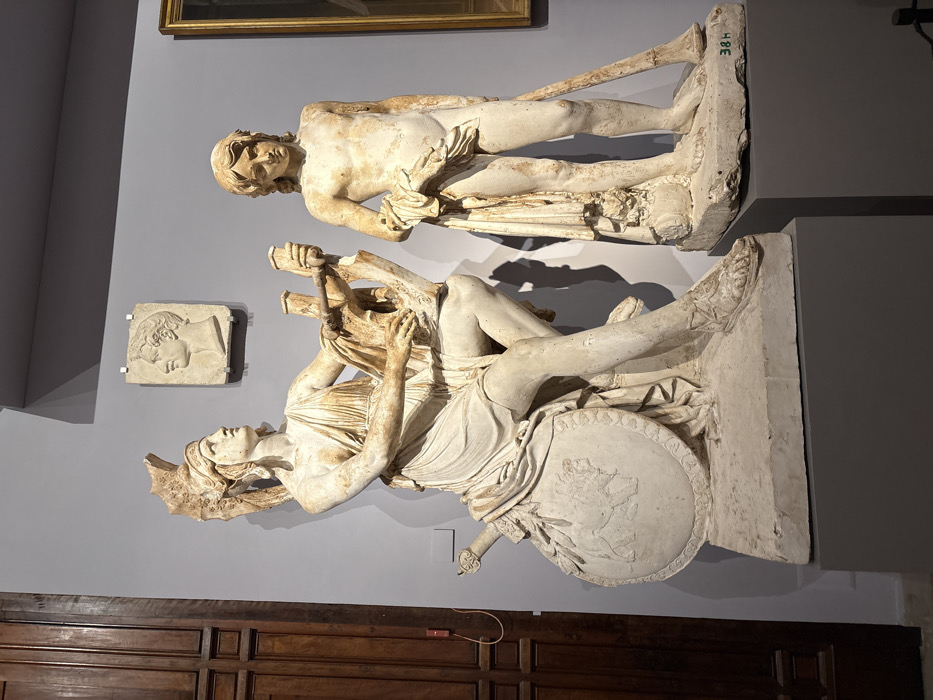 This image depicts an interior view of the Gipsoteca Bartolini within the Galleria dell'Accademia in Florence, Italy. The scene features two large, light-colored plaster cast sculptures displayed on dark grey plinths against a plain light grey wall. The prominent sculpture on the left is a seated female figure, identified as Athena, wearing a Corinthian helmet, a peplos, and sandals. She supports a damaged lyre with both hands, her head turned and gazing upwards and to the right. A circular shield, embossed with a lion motif, and a sword rest vertically by her left leg. The plaster is off-white with visible brown and orange discolorations and some surface imperfections. To the right, a standing male nude figure, likely Apollo, is presented. He has wavy hair and drapery partially covers his left arm. His right hand holds a long, slender staff or instrument that rests on the ground. He gazes forward and slightly to the left. The base of this sculpture is inscribed with "38H". This plaster also displays an off-white color with similar discoloration. On the wall between the two main sculptures, a smaller, rectangular plaster relief depicts a male profile head facing left. To the far left of the frame, a dark brown wooden paneled wall or door is partially visible. To the far right, a portion of a large, gold-framed painting is seen. Overhead lighting casts shadows from the sculptures onto the wall.
