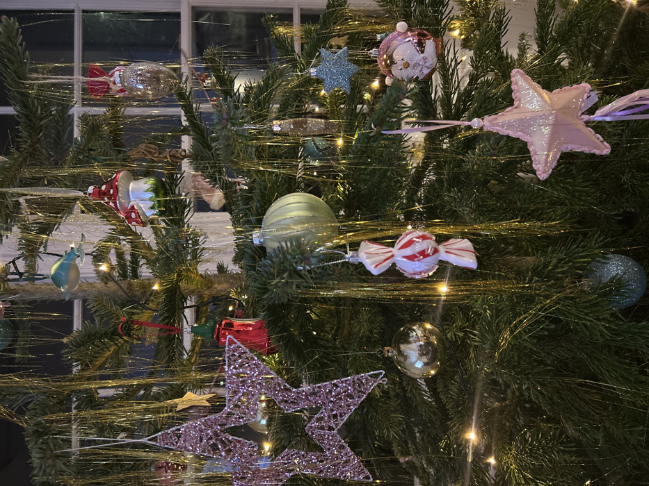 A Christmas tree decorated with various ornaments, including glittery stars, a candy ornament, a green sphere, and a snowman. Gold tinsel is draped across the tree. The tree is lit with small, warm-toned lights. A window with white frames is partially visible in the background.