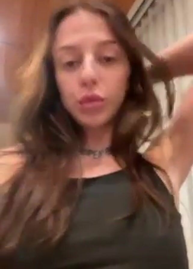 A light-skinned woman with brown hair that goes down to her chest, wearing a black tank top and a black choker-style necklace with lettering, is seen from a low-angle front view