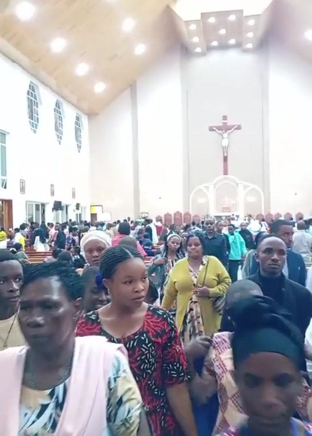 large group of people walking inside what appears to be a Catholic church. The attendees are diverse in age and attire, some wearing casual clothes and others in more formal attire. A large crucifix hangs over the altar. The space is well-lit with a high, vaulted ceiling. People are mostly walking forward. The scene implies a religious event, possibly the conclusion of a service or ceremony.