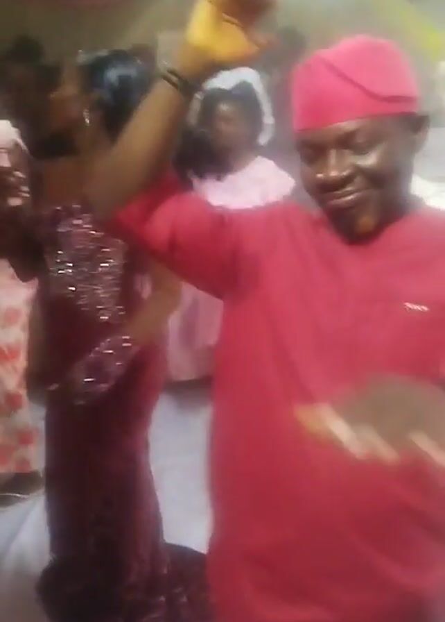 The video depicts a man in a red long-sleeved shirt and a red cap dancing at what appears to be a social gathering. He holds his right hand up in the air, gesturing as he dances, while keeping his left hand in his pocket at times. Behind him, a woman in a maroon sequined gown also dances, holding a small white cup or container in her hand. Other people, including children, are seen dancing in the background. The setting looks like a hall or indoor venue with a white dance floor and decorative elements like red drapes. The video quality is a little blurry and shaky, with the focus shifting slightly during the recording.