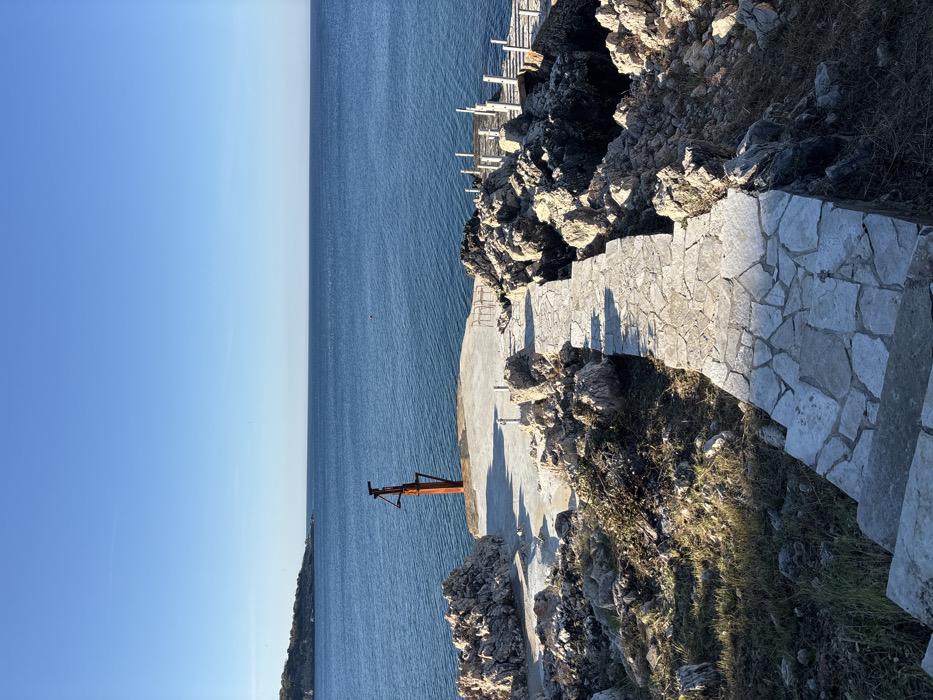 The image depicts a rocky coastline in Bar, Montenegro, under a clear blue sky. A stone-paved pathway, composed of irregularly shaped light-colored flagstones, leads from the foreground down towards the sea. The path initially descends as steps, then levels out before reaching a concrete platform. To the left of the path, the terrain consists of sparse dry grass and numerous light-colored, jagged rocks. To the right, darker, more rugged rocks are visible. Sunlight illuminates the scene, casting shadows primarily to the right side of the pathway and objects. On the concrete platform, a rusty, orange-brown metal structure, resembling an old davit or small crane, stands centrally. Further to the right on the platform, two light-colored, possibly metal, chairs are positioned near the edge. Beyond the concrete platform, a wooden pier or jetty extends into the calm, deep blue water of the Adriatic Sea. This pier is supported by multiple white vertical posts. A small, indistinct red buoy is visible floating in the water further offshore. In the background, the vast, placid blue sea meets a clear, cloudless sky at the horizon. A distant, dark green, tree-covered headland or promontory is visible on the left side of the sea horizon. No individuals or active subjects are present in the frame.