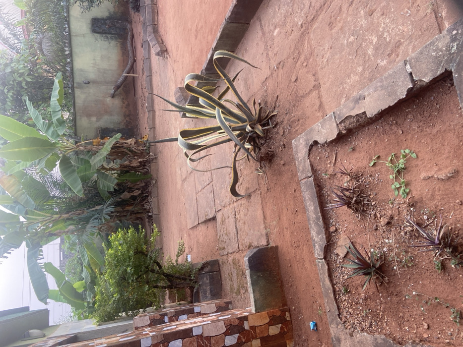 This is a shot of a garden, displaying a variety of plants. A large agave plant sits to the right, with long, curving leaves. Beside it is a concrete-edged garden bed, which houses several smaller plants and weeds. To the left, lush banana trees add a tropical vibe. Additionally, a small leafy tree and assorted greenery contribute to the space's overall appearance. The ground is primarily earth-toned, with scattered stones and tiles serving as pathways.