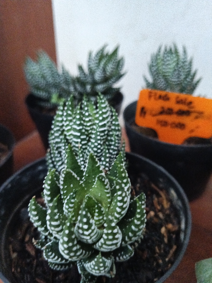 Several small potted Haworthia plants are arranged on a surface. The foreground plant has bright green, tear-drop shaped leaves with white dot patterns. Behind it is a similar but taller plant with tightly packed leaves. Further back are two more plants with blurrier foliage, all in black pots. An orange tag is visible near one of the back plants. The soil in the pots is dark and dry. The background is a blurry white wall.