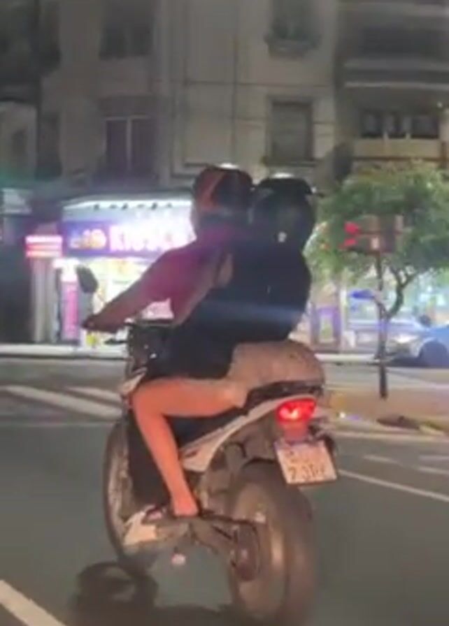 A scooter with two people is on the street. The person driving the scooter is wearing a red shirt and an orange helmet. The person on the back is wearing a black helmet and has a backpack on. The scooter is white and black. The background has a building with a sign that says "KIOSCO." The street appears to be in a city and is lit up by streetlights. The scooter drives by various stores, including an eye glasses store and a clothing store. The scooter is going forward in a straight line. The video seems to have been filmed from within a car behind the scooter.