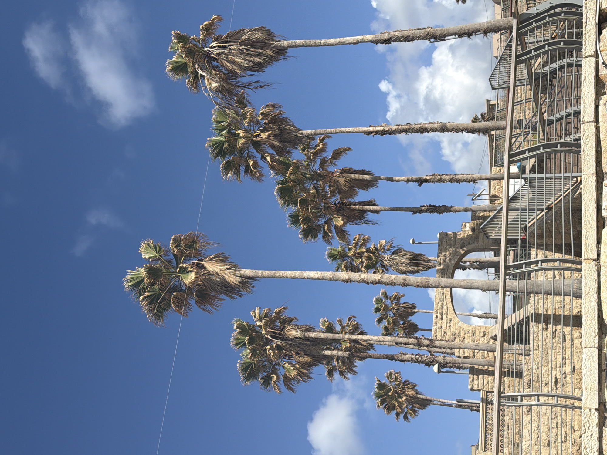 view of palm trees lining a building in Tel Aviv, Israel. The sky is blue with scattered clouds. The building is made of light-colored stone and has a metal staircase. There are streetlights visible along the building. The image is shot from a low angle, looking up at the palm trees and building.