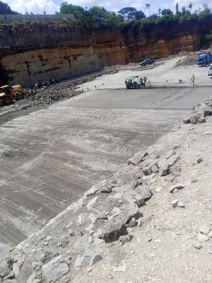 This image captures an active, large-scale excavation and construction site in Juja, Kenya, viewed from an elevated vantage point on the right. The site features a deep pit with prominent, layered rock and soil walls rising steeply on the left and rear, topped by green vegetation under a partially cloudy sky. The ground level of the excavation is largely a wide, flat, light grey surface, exhibiting linear marks and tire tracks, consistent with prepared sub-base or recently laid concrete. Along the base of the left excavation wall, dark grey rock aggregates are piled, adjacent to what appears to be a retaining wall construction. Approximately 10-15 individuals, some wearing head coverings, are visible on the far left, near two yellow backhoe loaders. They appear to be engaged in manual labor, possibly handling the rock aggregates. In the central mid-ground, a green paving or finishing machine with a roller attachment operates on the flat grey surface. Near this machine, two workers are present; one operates the equipment, and another, wearing a yellow high-visibility vest, stands adjacent. Further right in the mid-ground, an additional worker kneels on the grey surface, and another individual, also in a yellow high-visibility vest, stands with a long pole-like tool. In the background, on an inclined dirt path leading out of the excavation, a dark blue sedan or SUV, a blue dump truck with a white cab, and a white utility vehicle are parked. The immediate foreground on the right consists of an uneven slope composed of loose grey rocks, gravel, and exposed earth.