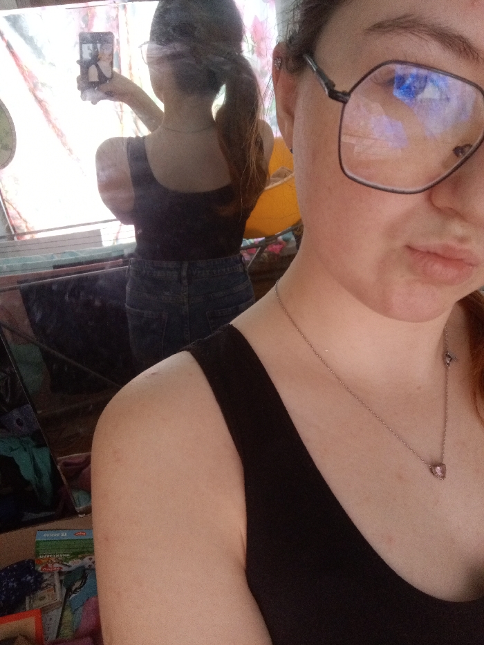 A person is depicted taking a mirror selfie within an indoor setting in Старый Шагирт, Russia. The foreground shows the right side of the individual's face, shoulder, and upper chest. The person wears large, dark-framed, geometric glasses, with blue reflections visible in the lenses. A thin silver-colored necklace with a small pink heart-shaped pendant rests on the chest. The reflection in the mirror shows the individual from the back, holding a black smartphone with both hands to capture the image. The person in the reflection wears a black tank top and light blue denim jeans, with long brown hair tied in a ponytail. The mirrored background reveals a cluttered room with a light-colored curtain displaying faint patterns, a horizontal surface, and various objects including folded clothing, a cardboard box, and a prominent bright yellow item.