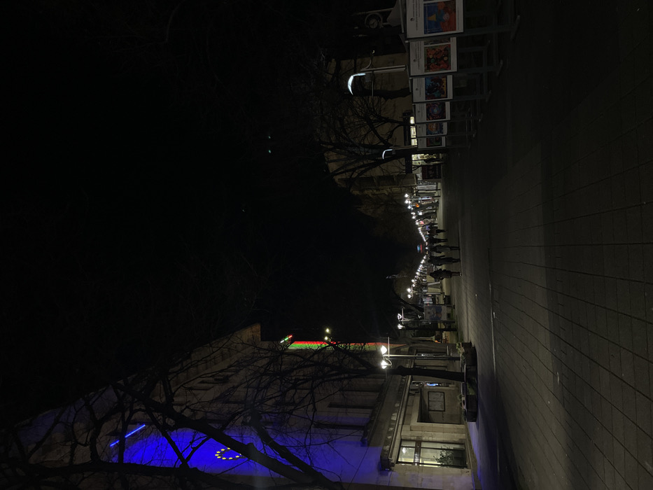 The image depicts a nighttime scene on Alexandrovska Street, a prominent pedestrian promenade in Burgas, Bulgaria. The perspective is down the length of the street, showing its urban environment and artificial illumination. To the left, a multi-story building with a light-colored facade is illuminated. Its upper section features a large blue light projection with the yellow star circle symbol of the European Union, positioned beside a vertical light display showcasing the white, green, and red stripes of the Bulgarian flag. This building is identifiable as the Burgas Municipality building. Bare-branched deciduous trees stand in front of this building, with low planters at their bases. Modern streetlights with rounded fixtures line this side of the street. The pedestrian pathway is paved with interlocking pavers forming a geometric pattern. In the mid-ground and extending into the background, approximately 8-10 individuals are observed walking along the street, alone or in small groups. Their specific features are not discernable. On the right side of the foreground, a series of roughly eight freestanding display panels, each exhibiting multiple colorful posters, are arranged. Beyond these panels, other buildings with illuminated storefronts line the street into the distance. Additional streetlights illuminate this side of the promenade. The sky above is dark, indicating night.