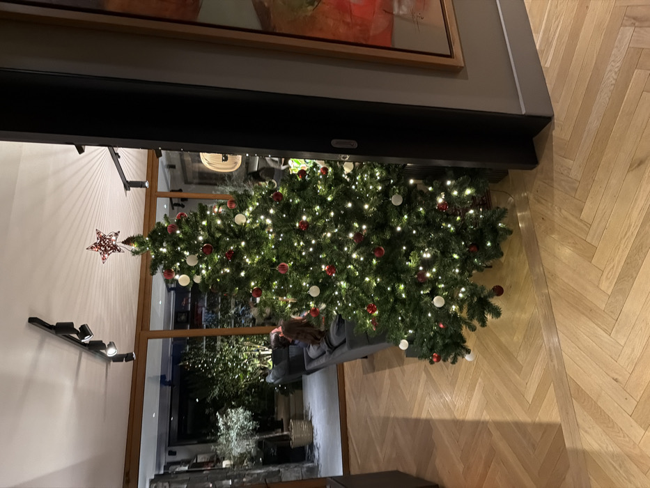 A decorated Christmas tree fills the frame, seen through an open doorway or window. The tree is adorned with white and red ornaments and twinkling lights. Beyond the tree, a glimpse into another room shows more greenery and a seating area. A star-shaped decoration hangs on the wall, illuminated by track lighting. The scene suggests a cozy, festive holiday setting. The floor has a herringbone pattern of light-colored wood. An abstract painting hangs on the wall.