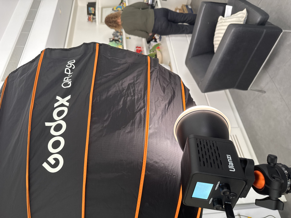 The scene is set indoors, likely a residence or studio, in Ramat HaSharon, Israel. In the foreground, a large black Godox QR-P90 parabolic softbox with white branding and orange accent stripes is prominently positioned, partially obscuring the background. Below and to the left of the softbox, a black Ulanzi LED video light, mounted on a tripod, is illuminated and faces the softbox. The light features a small blue digital display and control knobs. To the right, a black, modern armchair with metal legs contains a striped pillow. In the background, a person with curly, light brown hair, wearing a dark green long-sleeved shirt and dark pants, stands with their back to the camera, appearing to organize or examine items on white shelves or cabinets. Various colorful objects are visible on these shelves. The room features white walls, a light gray tiled floor, and a linear air conditioning vent visible on the ceiling.