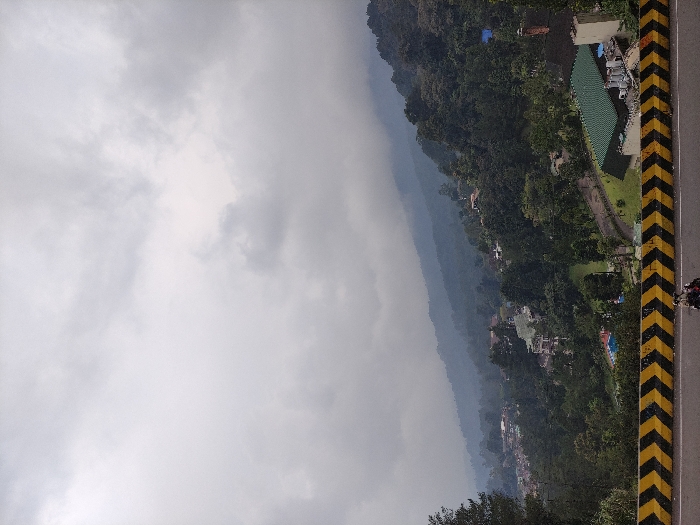 The image presents an elevated panoramic view of a densely forested valley in Staufenberg, Germany, under a uniformly overcast sky. In the immediate foreground, a dark asphalt road is visible, bordered by a prominent safety barrier featuring a continuous pattern of yellow and black chevron stripes running horizontally across the frame. A small, dark object resembling a motorcycle or scooter is partially discernible at the bottom center, positioned directly behind the barrier. Below the foreground barrier, the terrain slopes downward, characterized by extensive tree cover comprising both coniferous and deciduous species. Scattered within this verdant landscape are several buildings: a multi-story structure with light-colored facades and balconies is visible towards the left of center. To its right, a blue-tiled swimming pool area is clearly visible. Further to the right, a building with a distinctive dark green, possibly ribbed or corrugated, roof is present, accompanied by what appear to be rooftop installations or industrial apparatus on an adjacent section. Manicured lawns and paved pathways are also visible near this structure. In the middle ground, additional structures are interspersed within the extensive tree cover. The background is dominated by a range of forested mountains or hills, their upper slopes partially obscured by atmospheric haze or low-lying grey clouds that blend into the thick, overcast sky. No individuals are present in the scene, and no specific actions or interactions are depicted.