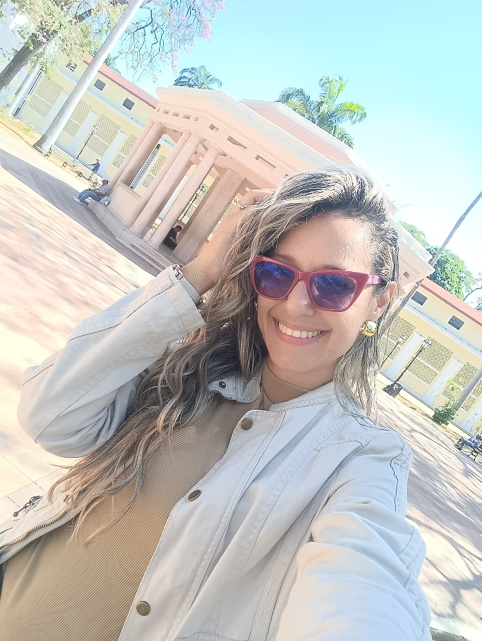 An outdoor selfie captures a woman smiling in the Plaza Bolívar de Maracay, Venezuela, on a clear, sunny day