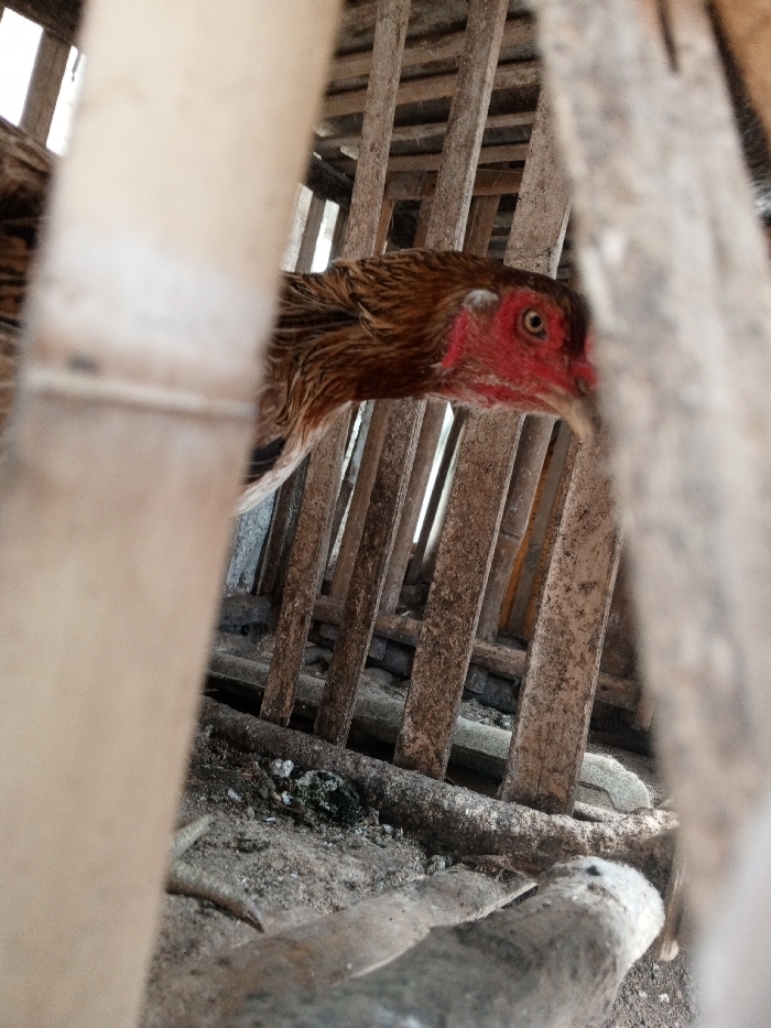 - "This image, captured in Limbangan Sari, Indonesia, displays a brown and black feathered chicken contained within a rustic wooden slatted enclosure" by FM-Yc0yt1, licensed under CC BY 4.0
