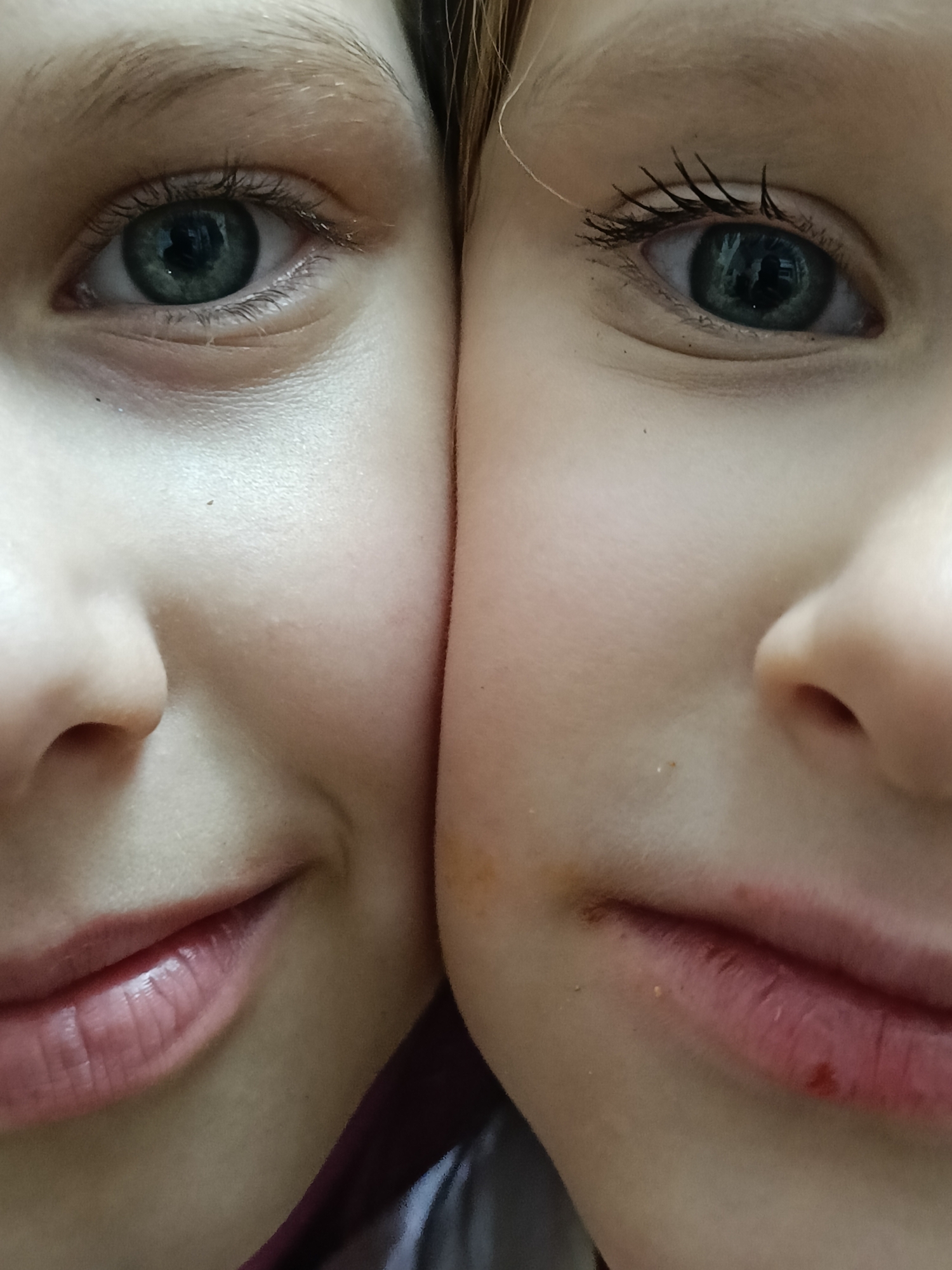 close-up of the faces of two young individuals, likely children. Their faces are positioned side-by-side, almost touching. Both have blue-green eyes. The individual on the left has natural eyelashes. The individual on the right has mascara. The skin tones are similar, fair with slight redness. The lips have a pinkish hue; the individual on the right has a mark on their lower lip. The background is out of focus. The image does not contain information to link the subjects to Rusalevka, Russia or any specific location.