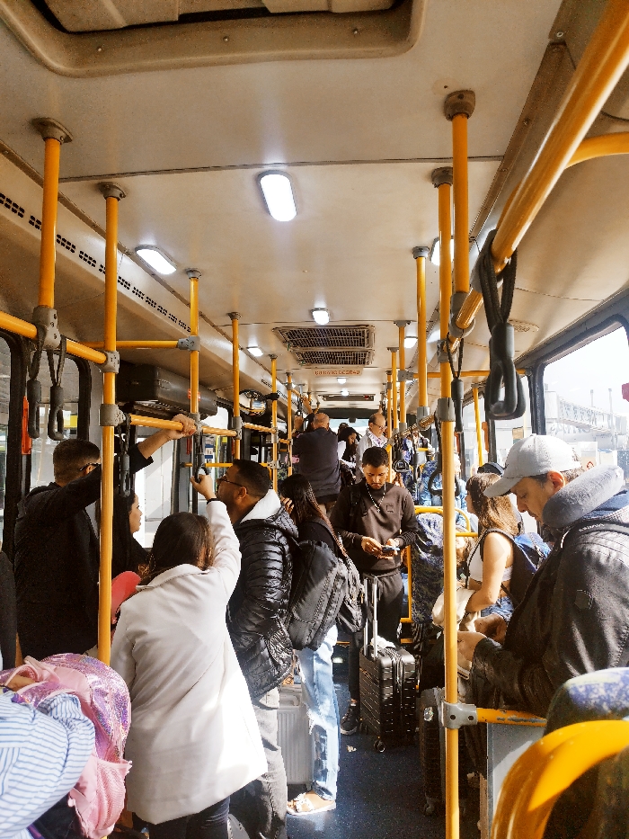- "The image displays the interior of a crowded public transport bus in Guarulhos, Brazil, likely operating as an airport shuttle service to or from Guarulhos International Airport (GRU)" by FM-ZqBmD2, licensed under CC BY 4.0