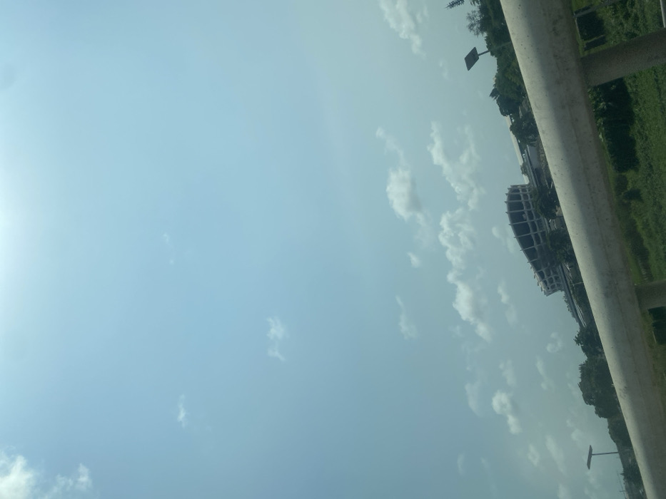 The image presents a clear, bright daytime scene under a light blue sky with scattered small white cumulus clouds, more concentrated towards the lower horizon. In the mid-ground, a large, multi-story, curvilinear building with a distinctive ribbed or arched facade is prominently visible. The structure, appearing to be made of light-colored concrete, is partially surrounded by dense green foliage and trees. Several dark-colored utility poles, possibly streetlights with solar panels, are observed on the left and right sides of the frame. A thick, light-grey or white railing extends horizontally across the lower foreground, indicating an elevated vantage point such as a bridge or overpass, overlooking a grassy area. No individuals or active interactions are observed. The scene is located in the city of Alagbede, Nigeria.