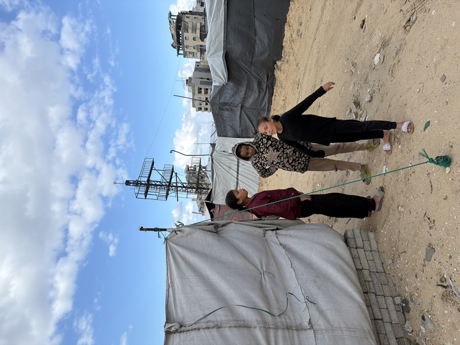 Three young females stand on sandy, unpaved ground in the city of Gaza, Palestinian Territory, under a partly cloudy blue sky. On the left, a makeshift structure constructed from light-colored canvas or tarpaulin rests on a base of grey concrete blocks. A green rope is visible, running vertically down the left side of the frame and tied to a coiled section on the ground. From left to right, the first girl wears a dark red long-sleeved top and dark trousers with sandals. The second girl wears a patterned long-sleeved top, light-colored trousers, and green sandals. The third girl, positioned slightly forward and to the right, wears a black long-sleeved top, black trousers, and white sandals, with her mouth slightly open as if speaking or singing, and her right arm extended slightly outwards. In the mid-ground, behind the children, another makeshift shelter made of dark tarpaulin is visible. Further in the background, a tall, open-lattice metal tower with multiple platforms stands prominently. To the right of the tower, several multi-story concrete buildings are visible, some exhibiting signs of damage or disrepair, with exposed structural elements on upper floors. The overall scene depicts a transitional or affected urban environment.