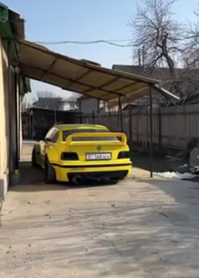 - "A yellow BMW E36 parked under a corrugated metal awning is shown in a close-up, stationary video shot from the rear" by FM-vOiHF2, licensed under CC BY 4.0