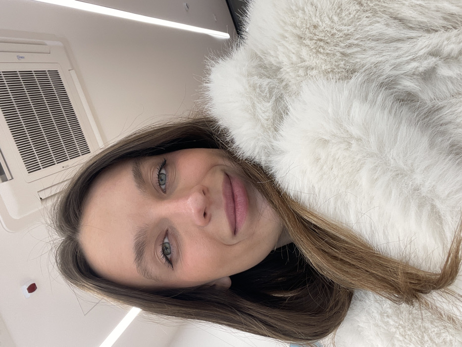 A young woman with long brown hair and blue eyes is angled downwards, facing the camera. She wears a fluffy, white fur coat or jacket. An air conditioning unit is visible in the upper left corner of the image. The lighting is bright and appears to be artificial. Her expression is soft, with a subtle smile.
