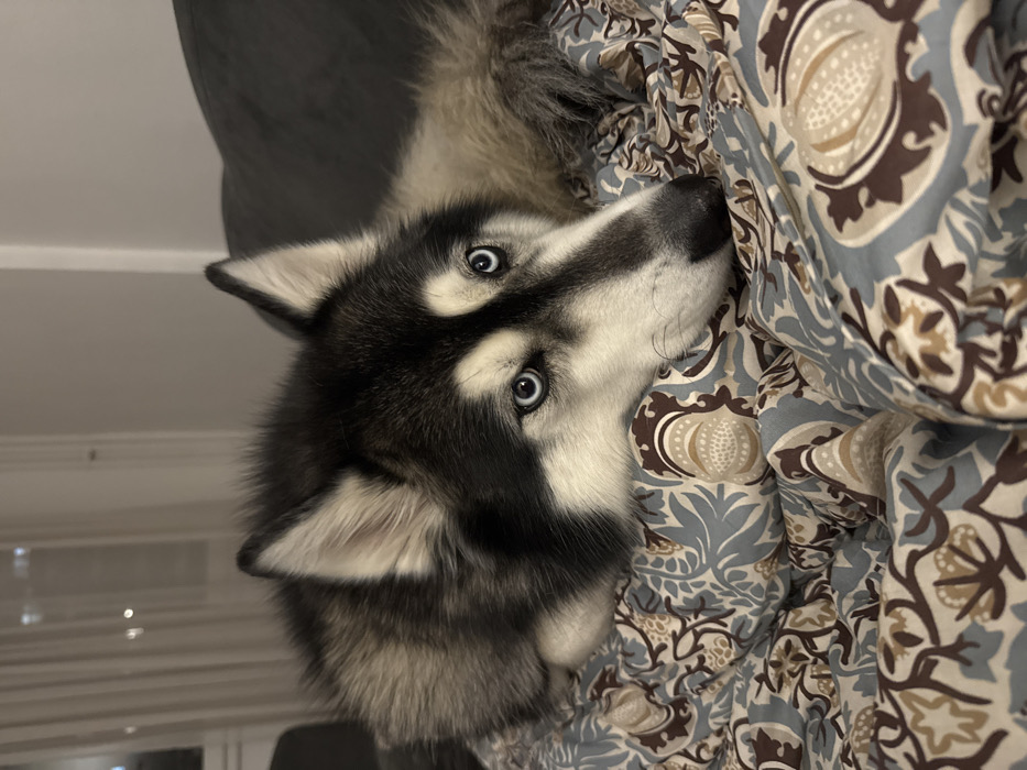 - "A Siberian Husky with striking blue eyes peeks inquisitively from beneath a duvet" by FM-ErwQF2, licensed under CC BY 4.0